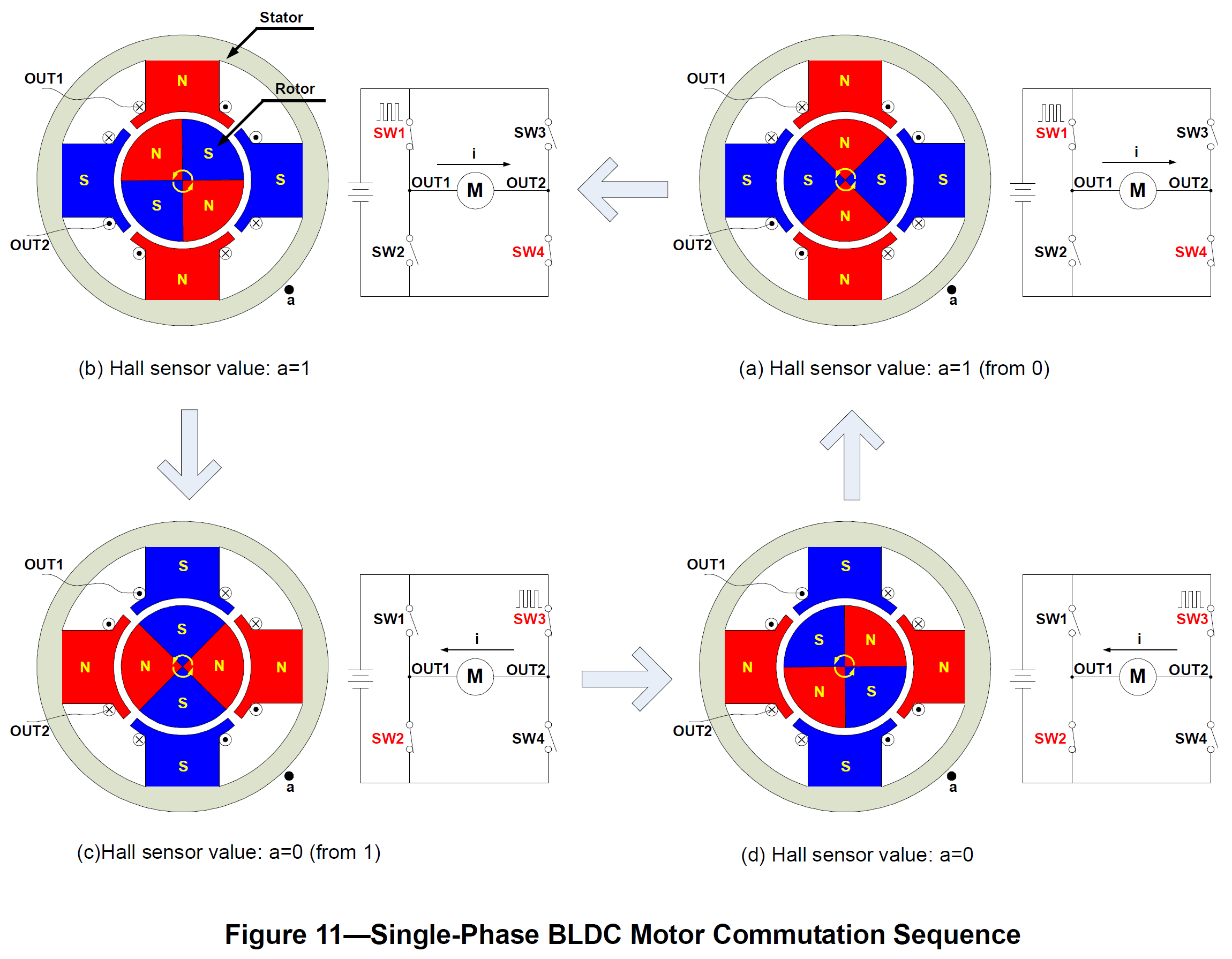 Figure 11 shows the commutation sequence of a single-phase BLDC motor driver circuit. The permanent magnets form the rotor and are located inside the stator. A Hall position sensor (“a”) is mounted to the outside stator, which induces an output voltage proportional to the magnetic intensity (assume the sensor goes HIGH when the rotor’s North Pole passes by, and goes LOW when the rotor’s South Pole passes by). SW1 and SW4 turn on when Hall sensor output is HIGH, as shown in Figure 11(a) and (b). At this stage, armature current flows through the stator windings from OUT1 to OUT2 and induces the alternate stator electromagnetic poles accordingly. The magnetic force generated by rotor magnetic field and stator electromagnetic field causes the rotor to rotate. After the rotor signal reaches 180°, the Hall output voltage reverses due to its proximity to a South Pole. SW2 and SW3 then turn on with current reversing from OUT2 to OUT1, as shown in Figure 11(c) and (d). The opposite stator magnetic poles induce the rotor to continue rotating in the same direction.