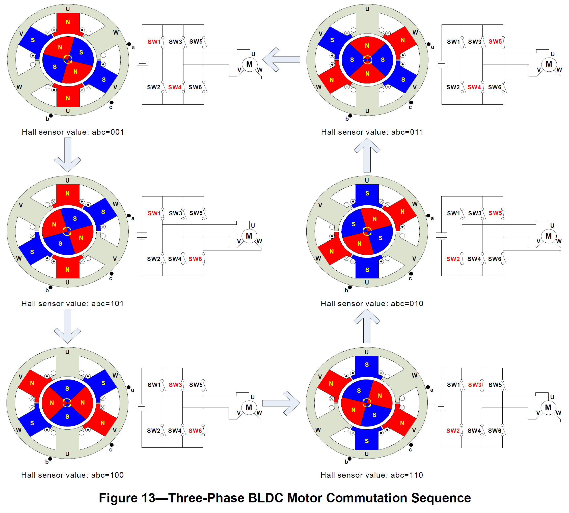 Figure 13 shows the commutation sequence of a three-phase BLDC motor driver circuit for counter-clockwise rotation. Three Hall sensors—“a,” “b,” and “c”—are mounted on the stator at 120° intervals, while the three phase windings are in a star formation. For every 60° rotation, one of the Hall sensors changes its state; it takes six steps to complete a whole electrical cycle. In synchronous mode, the phase current switching updates every 60°. For each step, there is one motor terminal driven high, another motor terminal driven low, with the third one left floating. Individual drive controls for the high and low drivers permit high drive, low drive, and floating drive at each motor terminal.