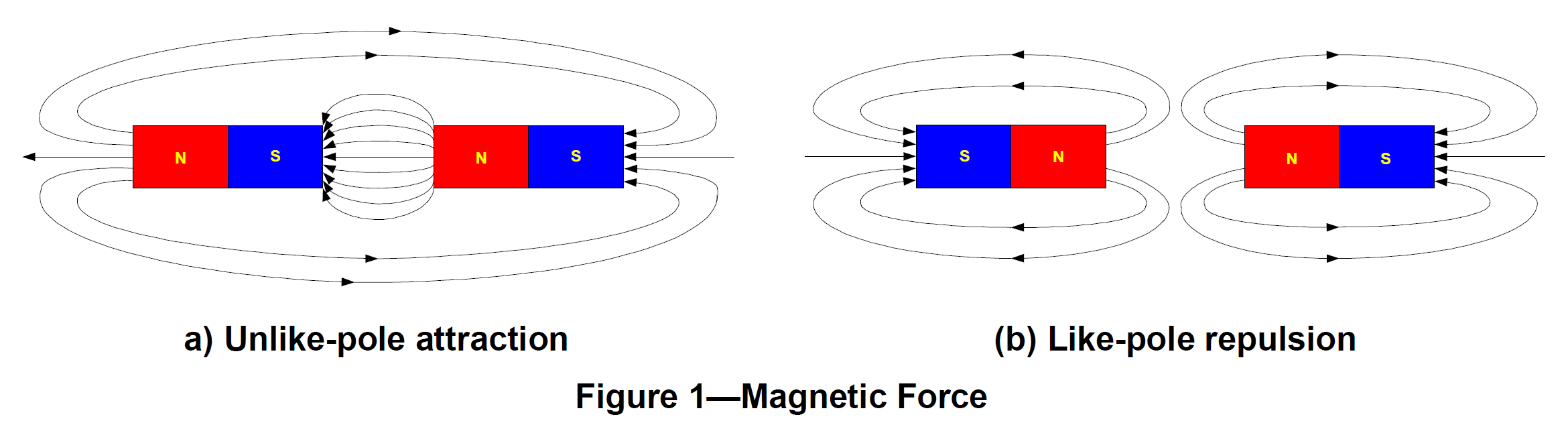 Magnetic poles generate invisible lines of magnetic force flowing from the north pole to the south pole as shown in Figure 1. When magnetic poles of opposite polarity face each other, they generate an attractive force, while like poles generate a repulsive force.