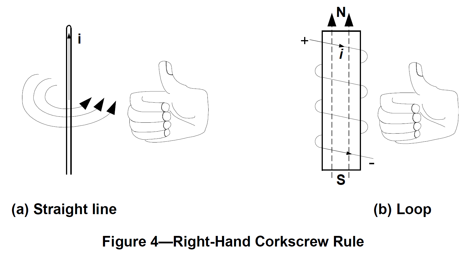Right-Hand Corkscrew Rule: For a current flowing in a straight line as shown in Figure 4(a), the thumb points in the direction of the current I, and the fingers curl in the direction of the magnetic field B. For a coiled current as shown in Figure 4(b), the fingers curl in the direction of the current I, and then the thumb points in the direction of the magnetic field B through the center of the loop.