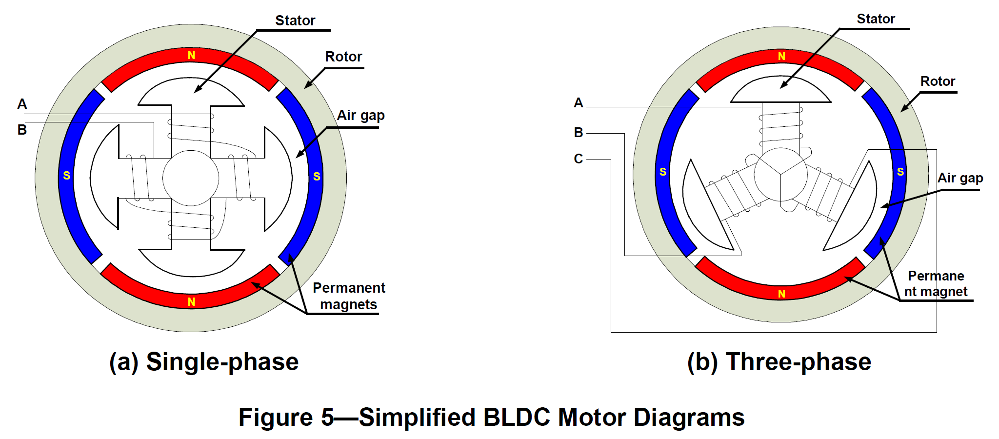 There are three classifications of the BLDC motor: single-phase, two-phase and three-phase. This discussion assumes that the stator for each type has the same number of windings. The single-phase and three-phase motors are the most widely used. Figure 5 shows the simplified cross section of a single-phase and a three-phase BLDC motor. The rotor has permanent magnets to form 2 magnetic pole pairs, and surrounds the stator, which has the windings.