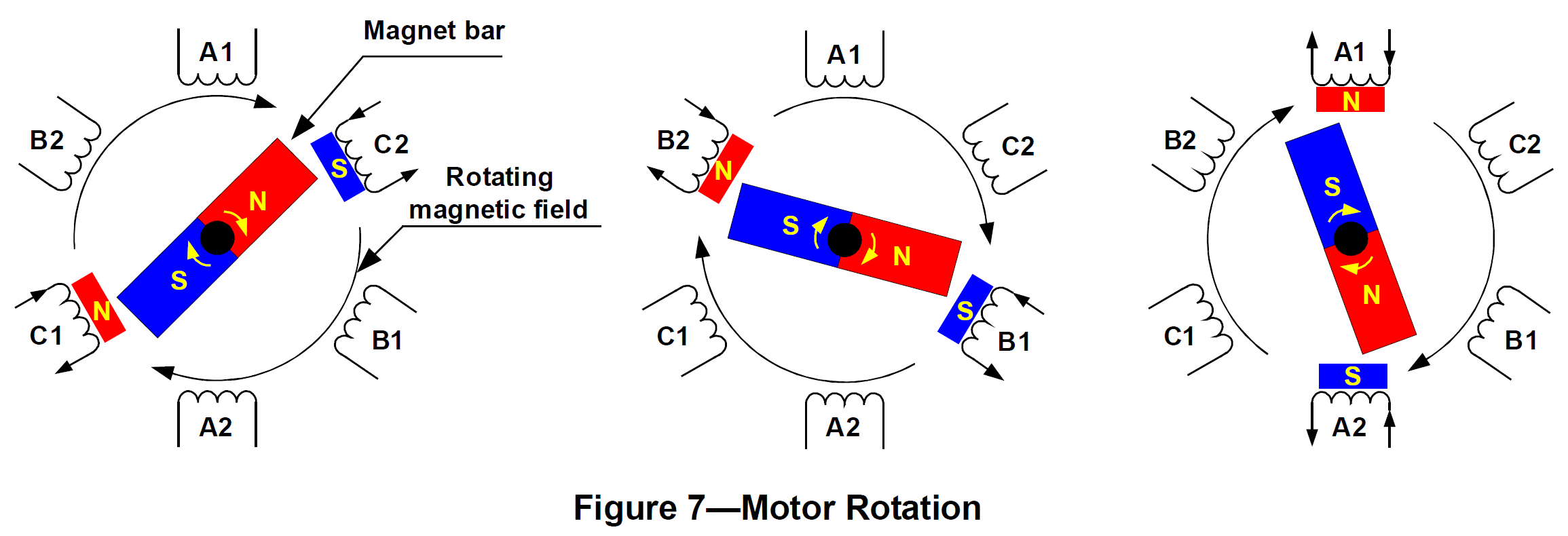 Motor operation is based on the attraction or repulsion between magnetic poles. Using the three-phase motor shown in Figure 7, the process starts when current flows through one of the three stator windings and generates a magnetic pole that attracts the closest permanent magnet of the opposite pole. The rotor will move if the current shifts to an adjacent winding. Sequentially charging each winding will cause the rotor to follow in a rotating field. The torque in this example depends on the current amplitude and the number of turns on the stator windings, the strength and the size of the permanent magnets, the air gap between the rotor and the windings, and the length of the rotating arm.