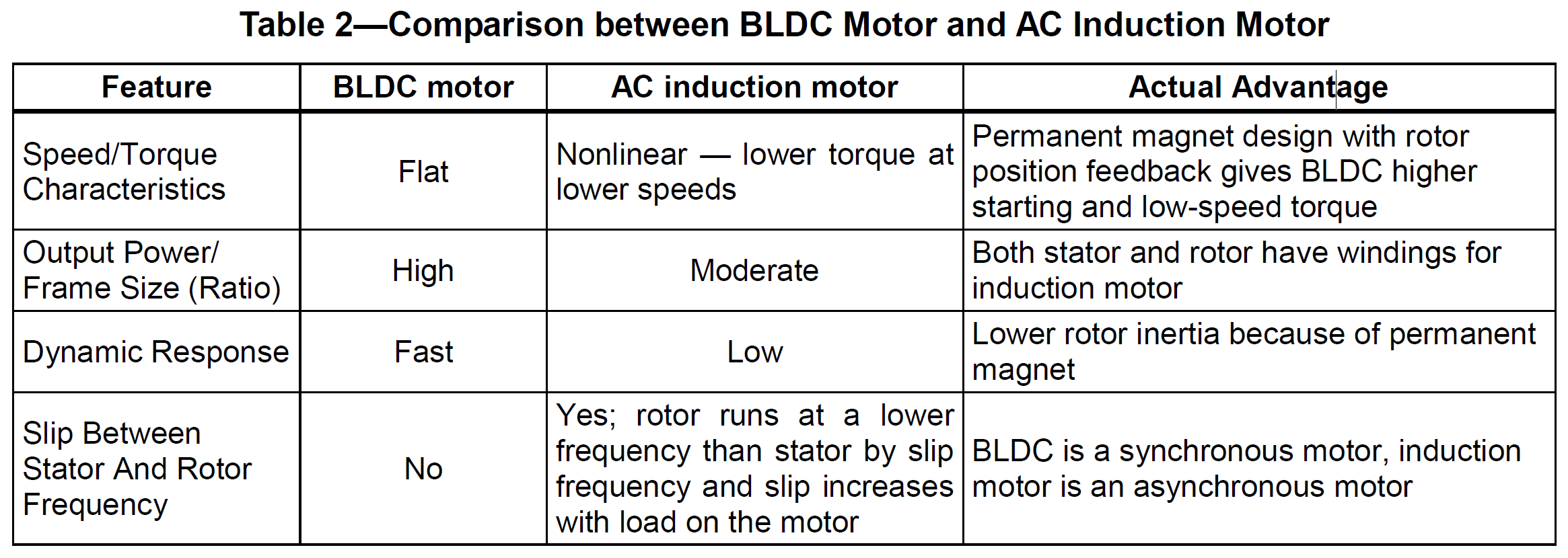 The BLDC motor has several advantages over other motors. Table 1 and Table 2 summarize the advantages of the BLDC motor when compared against a brushed DC motor and an AC induction motor.[1][3]